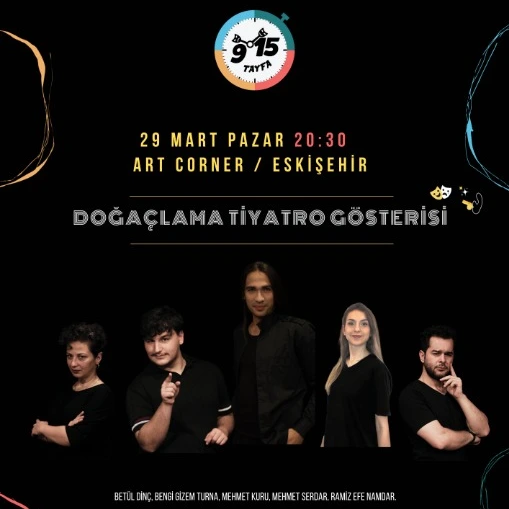 9.15 Tayfa doğaçlama tiyatro, kuralları bizden çıkış noktaları sizden keyifli oyun turlarını bir araya getirerek bütün bir gösteriyi anında sahnede seyircisine özel olarak sahnelendiği bazı turlarda seyiriclerimizden konuk oyuncu alarak oyun oynadığımız birlikte yaratmak,anda kalmak ve bu eğlencenin parçası olmak istersen biletler Bubilet'te!