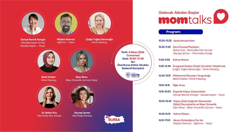 Bilet ücretine gün boyu sunumlar, öğle yemeği ve çocuk oyun atölyeleri dahildir.Momtalks Bursa 2026 için geri sayım başladı! Ebeveynlik yolculuğuna ilham veren konuşmalar, samimi paylaşımlar, kitap imzaları, çocuk oyun atölyeleri ve dopdolu bir programla yeniden bir araya geliyoruz.Bu özel buluşmada yerinizi alın, ilham dolu bu yolda birlikte yürüyelim. #Momtalks2026 #ozelbursakulturokullariTürkiye'nin ilk ve en kapsamlı ebeveyn-uzman buluşma platformu Momtalks, Bursay'a geliyor. Bugüne kadar binlerce ebeveyn ve eğitim ile buluşan Momtalks, 9.yılında yine dopdolu bir içerikle sizlerle buluşmaya hazırlanıyor.Yine harika bir kadro ve birbirinden değerli konularla, tüm gün sizlerle olacağız. Konuşmacı sunumları, öncü markalarla bir araya gelme, soru-cevap imkanı ve tüm gün sürecek kitap imzaları sizi bekliyor.MomTalks’un amacı, çocukların akademik, sosyal, duygusal gelişimlerindeki en güncel ve önemli konuları uzmanlarıyla masaya yatırıp ebeveynleri kaliteli ve doğru kaynaklarla buluşturmaktır.İyi bir gelecek, bilinçli aileden başlar.Tüm duyurularımıza ulaşmak ve diğer etkinliklerimizden haberdar olmak için Instagram hesabımızı ( https://www.instagram.com/momtalkstr/ ) takip etmeyi unutmayın.Sevgiler,MomTalks EkibiWeb: https://www.momtalks.com.trInstagram: @momtalkstr